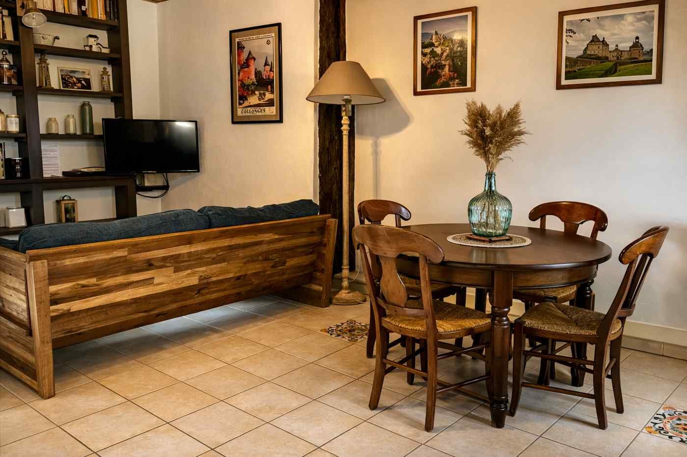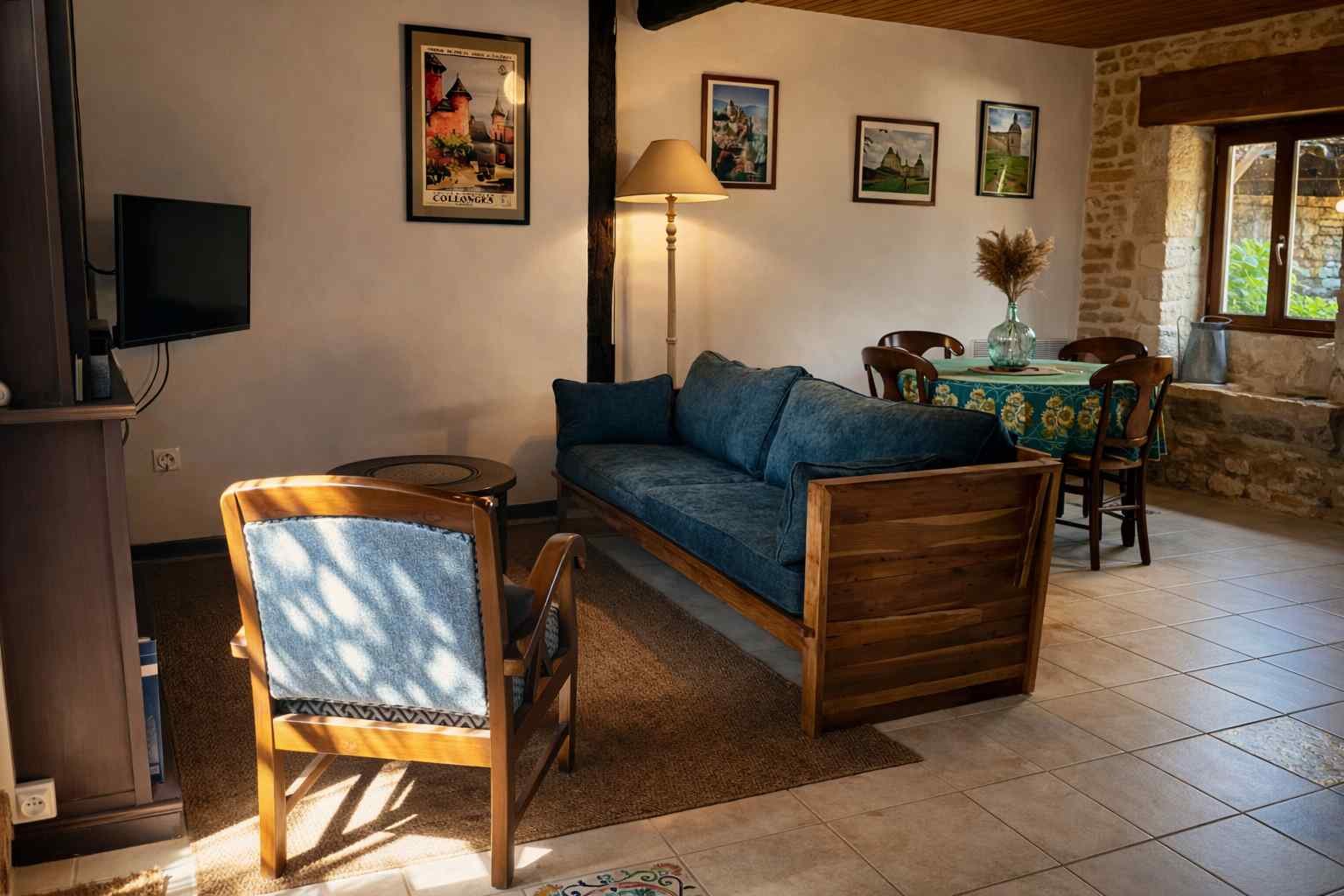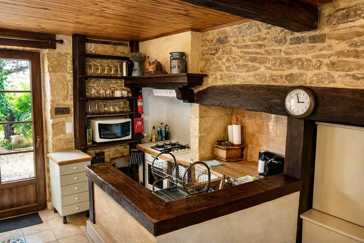 Esta encantadora casa de piedra de 65 m², con capacidad para 4 personas y entrada privada en planta baja, ofrece un espacio acogedor y lleno de carácter. Dispone de un salón con cocina americana totalmente equipada —fogones, horno, nevera, lavavajillas, cafetera, microondas, hervidor, tostadora y utensilios— además de un cómodo comedor para compartir momentos tranquilos.